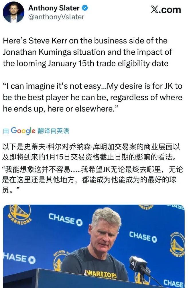 今夏休賽期,庫(kù)明加與勇士達(dá)成兩年4850萬(wàn)美元續(xù)約合同,第二年球隊(duì)選項(xiàng),前者還放棄了交易否決權(quán),那時(shí)就計(jì)劃好了會(huì)在本賽季中期為他尋找新下家,且如今科爾將其當(dāng)做透明人,總之分道揚(yáng)鑣幾乎已成定局。