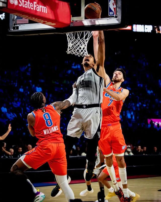 讓亞歷山大在更遠的地方出手,馬刺的防守就算成功,前者今天三分7中1,絕大多數(shù)的運動戰(zhàn)進球都是中投。能讓亞歷山大出手這么多的三分和中遠投,砍掉他的突破,這很大程度上源自文班在內線的威懾。