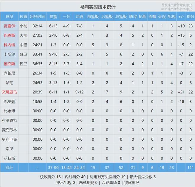 馬刺四人得分20+:瓦塞爾23分5板4助、文班亞馬22分9板2助2帽、福克斯22分2板4助2斷、卡斯?fàn)?2分6板2助。亞歷山大空砍29分4板5助。決賽時(shí)間是12月17日上午9點(diǎn)半,馬刺vs尼克斯!最后看看比賽數(shù)據(jù),說說你的心情:
