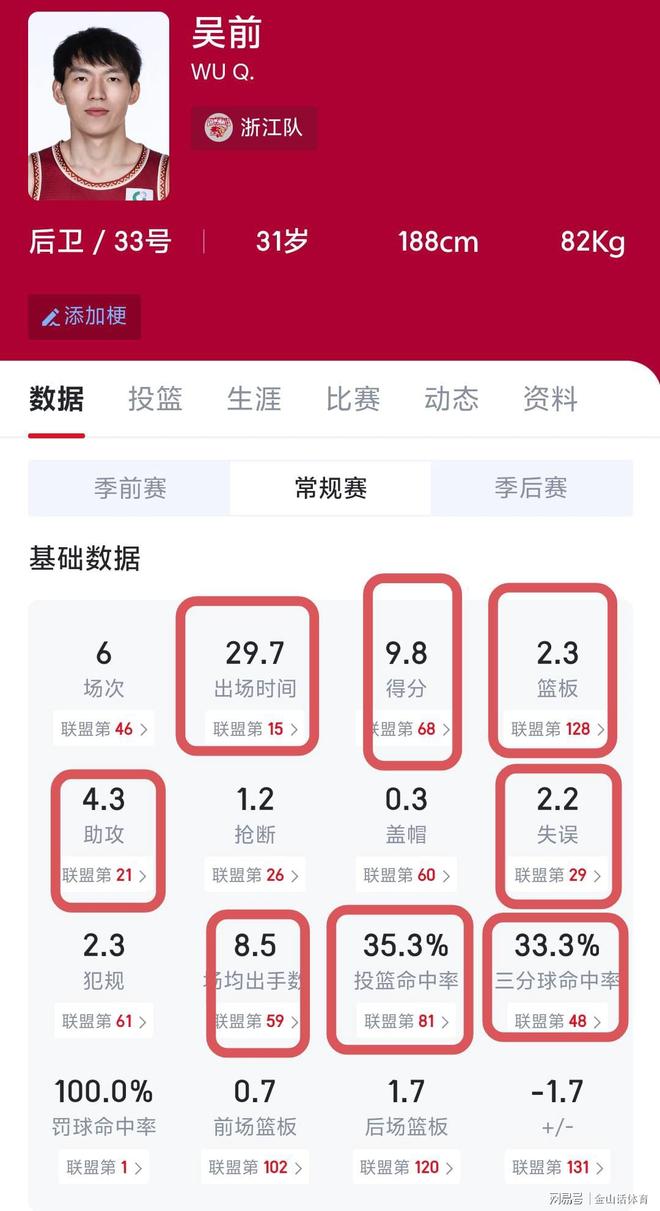 浙江隊本賽季的表現(xiàn)如此糟糕,成績?nèi)绱藨K淡,還有一個關(guān)鍵因素,那就是球隊管理層,包括教練團(tuán)隊在內(nèi),過分迷信31歲老將吳前。本賽季截止前7輪,吳前場均出場時間,高達(dá)29.7分鐘(排在全聯(lián)盟第15位),數(shù)據(jù)為9.8分2.3板4.3助攻,場均2.2失誤。場均出手8.5次,總投籃命中率只有35.3%,三分球命中率33.3%。其得分、籃板、助攻、總投籃命中率、三分球命中率,均創(chuàng)下職業(yè)生涯新低。